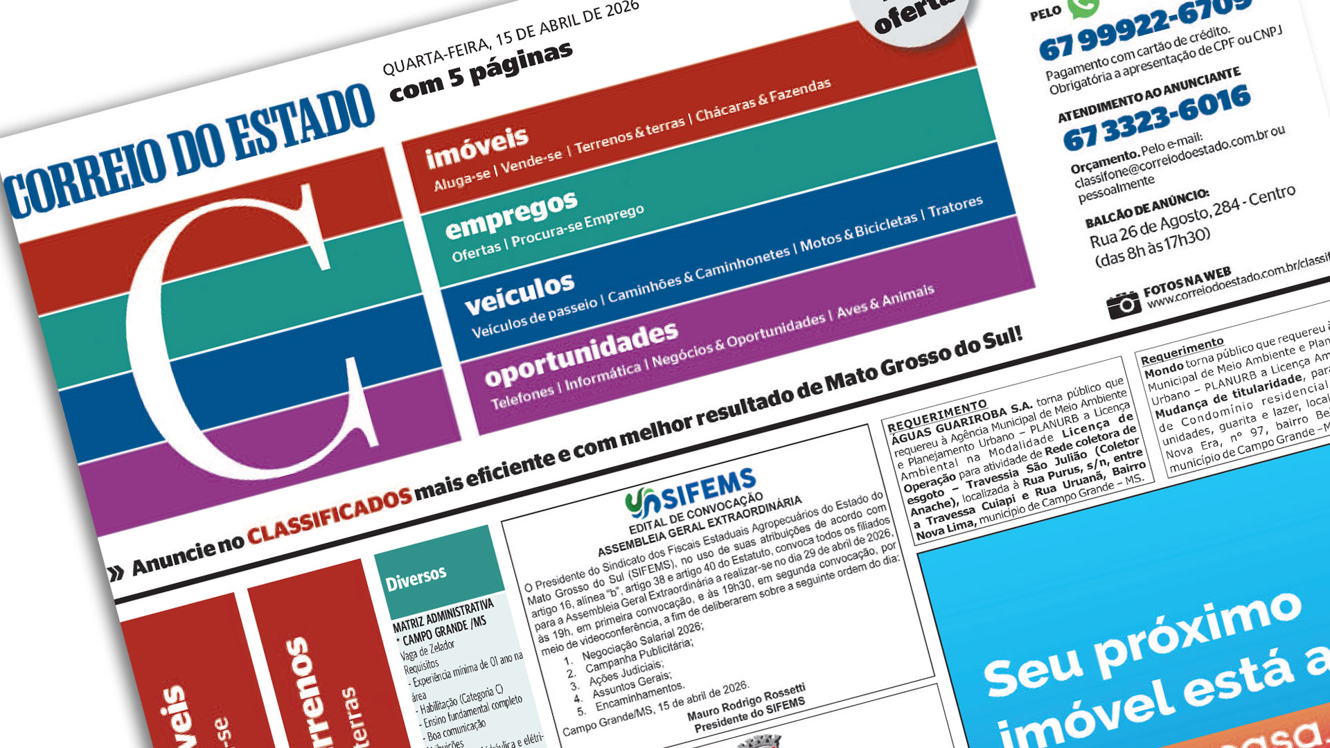 O Sifems publicou edital de convocação de assembleia geral no dia 29 de abril, às 19h, que será realizada de forma virtual, via videoconferência, facilitando a participação dos filiados de todo o estado. Em pauta , estará o debate da Negociação Salarial de 2026. Além da pauta financeira, a diretoria e os filiados discutirão o lançamento de uma nova campanha publicitária e o andamento de ações judiciais de interesse dos servidores. Leia o edital publicado nesta quarta-feira, dia 15 de abril, na edição do Correio do Estado: