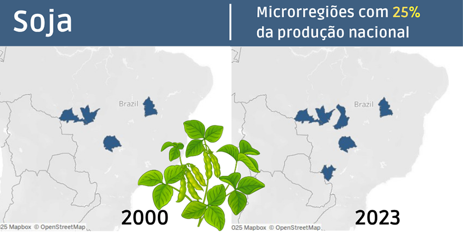 A produção de soja cresceu e se expandiu pelo território nacional. A concentração diminuiu, mas regiões com forte produção em 2000 permaneceram entre as de maior destaque. Naquele ano, Parecis (MT), Alto Teles Pires (MT), Barreiras (BA) e Sudoeste de Goiás (GO) respondiam por 25% da produção nacional. Em 2023, a fatia passou a ser dividida com Canarana (MT) e Dourados (MS).