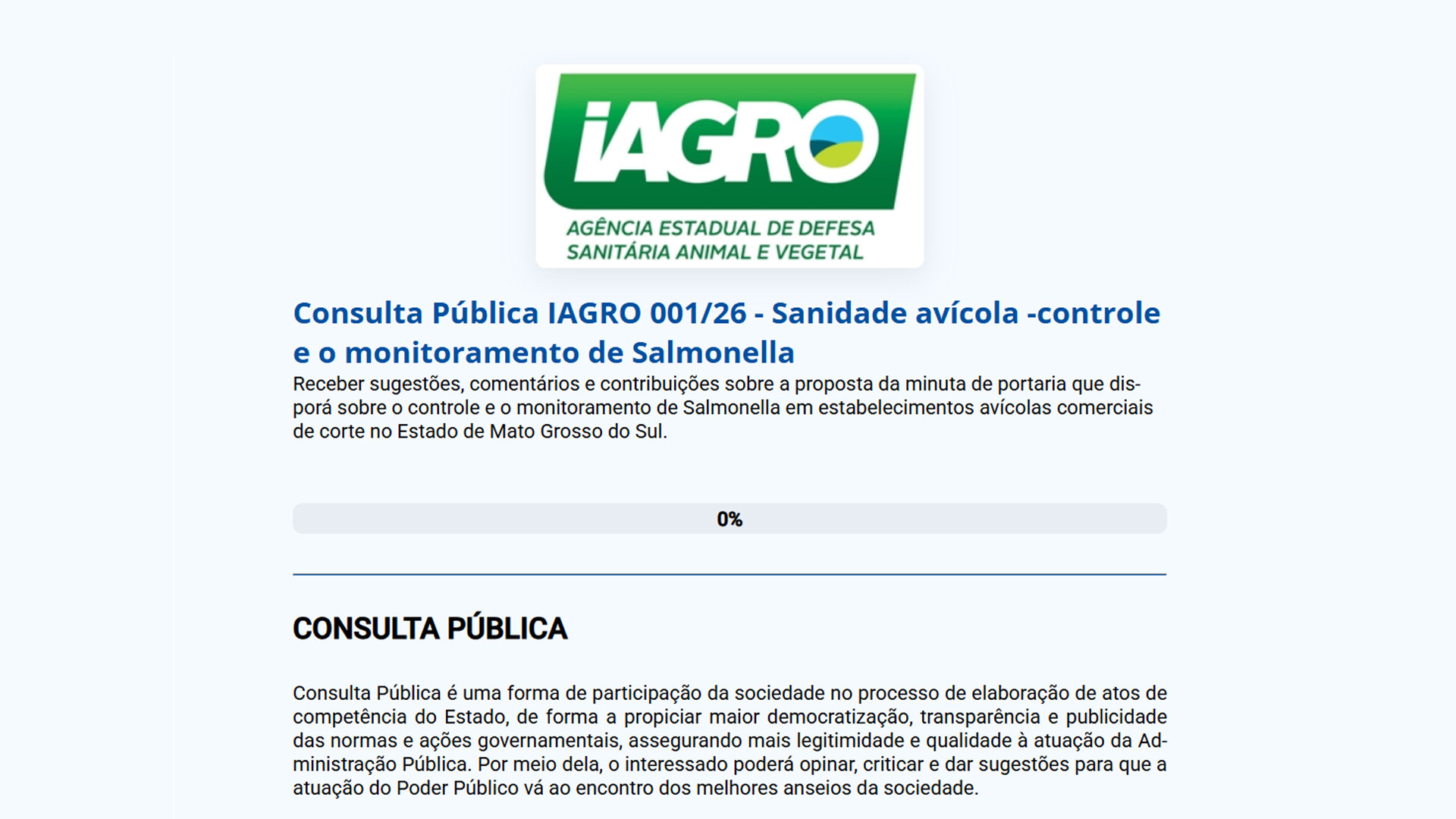 A Iagro está com consulta pública aberta sobre o controle e o monitoramento de Salmonella em estabelecimentos avícolas comerciais de corte no Estado de Mato Grosso do Sul. O objetivo da consulta pública nº 001/2026 é receber sugestões, comentários e contribuições sobre o controle e o monitoramento de Salmonella em estabelecimentos avícolas comerciais de corte no Estado de Mato Grosso do Sul, com vistas à elaboração de ato normativo sobre a matéria.