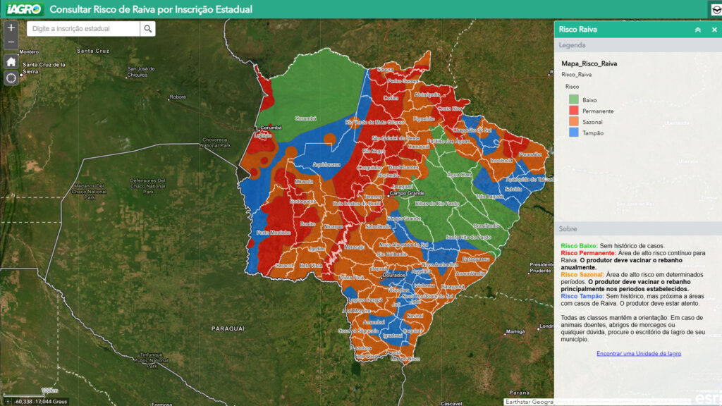 “Ele identifica o nível de risco de ocorrência da raiva em diferentes áreas. Ao informar os dados cadastrais da propriedade, o sistema a posiciona e indica o nível de risco específico daquela localização. Em áreas de risco, recomenda-se a implementação de uma vacinação estratégica para prevenção. Além disso, o sistema permite que os revendedores acessem essa informação, auxiliando-os a determinar se seus clientes estão localizados em áreas de risco. Essa ferramenta representa um avanço significativo no contexto da inteligência territorial, desenvolvido pela Iago, e se diferencia das soluções presentes em outros estados brasileiros”, concluiu.
